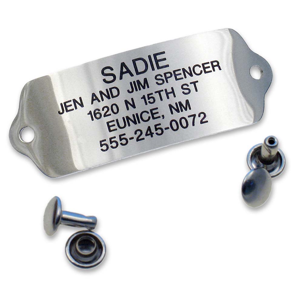 Our dog collar tags attach directly to your dog's collar. These unique dog tags are designed to be quiet and out of the way of your dog's daily routine so they keep looking brand new for a long time. These personalized collar tags can be affixed to most collars in seconds and are perfect for replacing lost pet tags. Note: collars are not included with these ID tags. We also carry complete personalized dog collars as well. Browse a unique selection of collar tags for dogs below! And if you're shopping for your cat, check out our Cat Collar Tags page!
