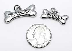 Choose from a paw, bone shape, flower shape, heart shape, skull and crossbones, heart, bone, clover, awareness ribbon, crossed bones, or Janey’s heart (named after our own office kitty!). Also featured is our charm bone, which is a cute little charm that can be personalized for your dog.