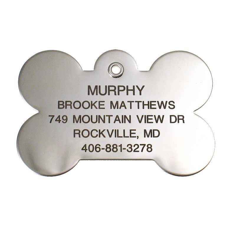 All of our brass and stainless steel dog tags are available in sizes small, medium, and large, except for the tiny oval which is available in one very small size; and the jumbo bone which is huge and only recommended for very, very large dogs. Personalize your engraved brass or stainless steel dog tags today!