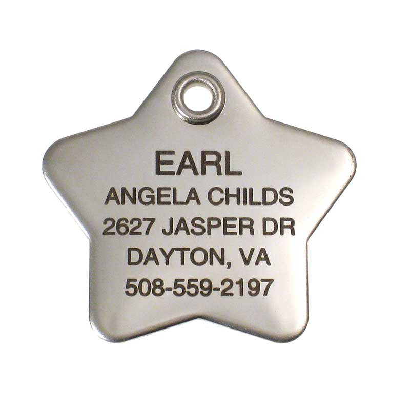 Luna the adorable pup is wearing a stainless steel star shaped pet tag.