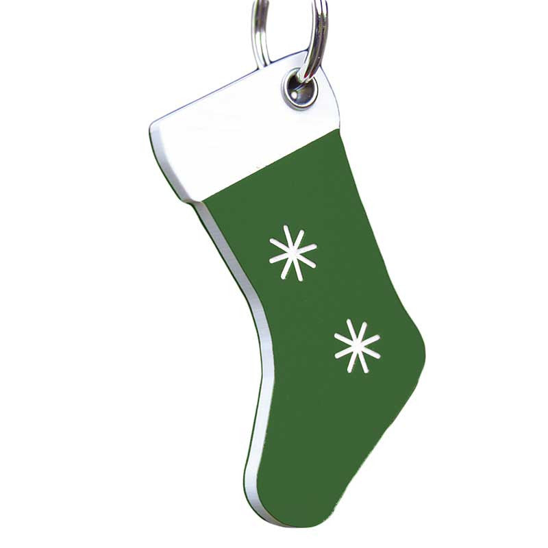 Our Holiday Stocking is our most popular seasonal pet tag and is sure to get your pets ready for the season. They feature snowflakes engraved on the front and your pet's info personalized on the back side. Just imagine how sharp your pet will look in their Santa pictures wearing these tags! These holiday pet tags are available in red or green, and in sizes small or large.